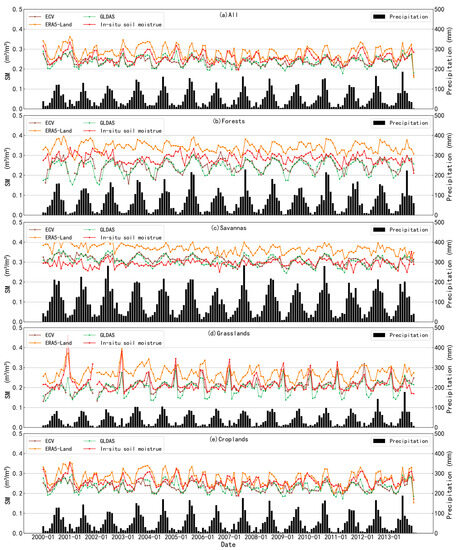 Time series of station means of four SM products and precipitation data on different land cover types: (a) all; (b) forests; (c) savannas; (d) grasslands and (e) croplands.