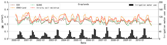 Figure 13 provides insights into the response of the three SM datasets to precipitation changes, highlighting their consistency, albeit with some lag effect. It is noteworthy that contrary to the basic theory, the in situ data consistently exhibit peak values in January of each year (Figure 13a). This could be attributed to the limited number of valid stations during this time, primarily located in southern China where SM tends to be high. Overall, the ERA5-Land product demonstrates slightly higher values compared to the other datasets, while closely resembling the temporal trend of the in situ data. The analysis of the temporal variation in SM across different land cover types in Figure 13 reveals that ECV and GLDAS exhibit highly similar trends. This may be attributed to the ECV product being scaled with the GLDAS Noah model, which consequently affects its absolute accuracy. Notably, the ERA5-Land data show significantly higher values in forest and savanna areas (Figure 13b,c), but its temporal trends align closely with the observed field data in cultivated areas. In savanna areas, ECV and GLDAS exhibit a temporal variation in SM that closely resembles the in situ data (Figure 13c). On the other hand, in grasslands (Figure 13d), the in situ data exhibit unusually high SM values in January, despite low annual precipitation. This can be attributed to the limited number of valid stations (0–5 stations) in the grasslands during this period. To investigate the impact of irrigation withdrawals on SM, the monthly changes in SM and irrigation withdrawals were analyzed specifically on cropland from January 2000 to December 2010, as depicted in Figure 14. It is evident that there is a pronounced trend of decreasing SM during the peak irrigation withdrawal period each year. This can be attributed to the increased water demand for crop growth during this period, resulting in a decline in surface SM content.