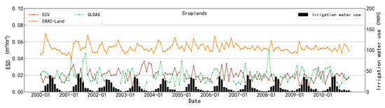 Time series of ESD of three SM products and irrigation water withdrawal on cropland.