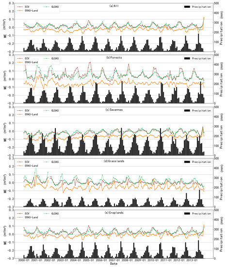 Time series of ME of three SM products and precipitation data on different land cover types: (a) all; (b) forests; (c) savannas; (d) grasslands and (e) croplands.