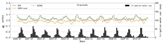 Time series of ME of three SM products and irrigation water withdrawal on cropland.