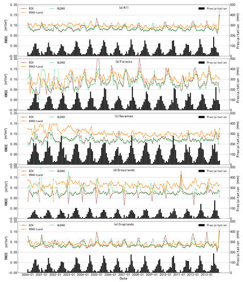 Time series of RMSE of three SM products and precipitation data on different land cover types: (a) all; (b) forests; (c) savannas; (d) grasslands and (e) croplands.