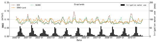 Time series of RMSE of three SM products and irrigation water withdrawal on cropland.