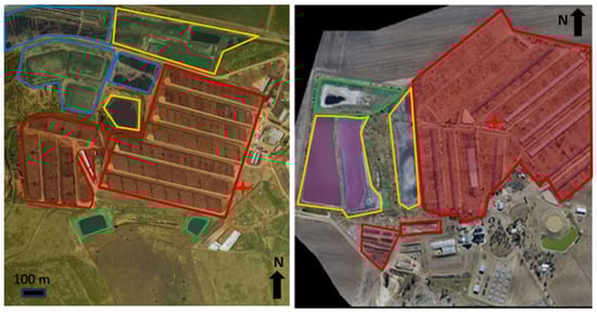 The southern site was a commercial feedlot 220 km northwest of Melbourne, Victoria. The terrain around the feedlot is typical of the eastern Wimmera region—flat topography, with dry bare soil in summer and crops growing in winter. The climatological average minimum and maximum air temperatures were 8.4 and 21.9 °C, respectively (Bureau of Meteorology, BOM, station ID 080128). Rainfall during the study was 553 mm in 2016, which was much higher than the average annual rate of 431 mm (BOM, station ID 080128). The feedlot is isolated and not impacted by other nearby sources of CH4, as demonstrated by atmospheric sampling surveys reported by Hacker et al. [21]. The main CH4 source areas included cattle pens (23.7 ha), a manure stockpile area (20 ha), and run-off ponds (0.3 ha) (Figure 1). The manure stockpile area consisted of mixed processed manure (with old (cured) and fresh manure), compost windrows, and stabilized sorted compost piles. As mentioned previously, emissions from manure processing areas are small compared to cattle enteric emissions, and therefore manure emissions were not measured in the study.