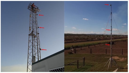 Concentration-profile tower at the southern feedlot with sampling heights of 7, 11, and 13 m (left panel); northern feedlot with sampling heights of 3, 5, and 8.5 m (right panel). Red arrows represent the gas sampling inlets. Closed-path FTIR at both sites was located in a shed office next to the tower (not shown in the northern site). The sonic anemometer was located 13.5 m above the ground (on the top of the tower) for the southern site, and 8.5 m above the ground at the northern site. Photos are created by the author, with the permission of farm owners.