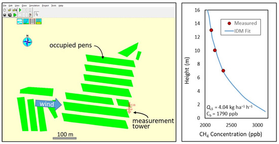 Example of the IDM methodology used to calculate feedlot emissions. The panel on the left is a WindTrax map for one particular 30 min observation period, defining the occupied cattle pens as the emission sources, and showing the wind and concentration measurement location (for the southern feedlot). The right panel shows the measured CH4 concentrations for one particular 30 min period, and the resulting WindTrax fit of the emission rate (QLS) and background concentration (Cb).