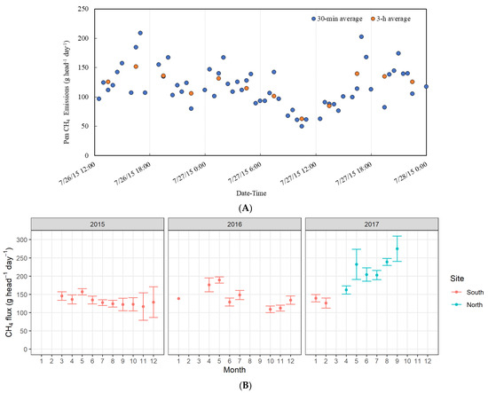 Figure 4A shows an example of the CH4 emission time series calculated for the southern feedlot during a 36 h period. The 30 min data set is not continuous due to data quality filtering. We group the available 30 min data into 3 h (or 6 h) bins and calculate the bin average emission rates, which are used to calculate daily emission rates. The 3 h bin averages (Figure 4A) show the diurnal pattern of emissions from the feedlot, with peak emission rates at ~18:00, and minimum rates in the late morning. This is a typical pattern and is associated with animal feeding times and animal activities, and has been reported in many publications including our previous work by Bai et al. [13].