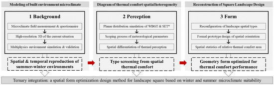 Thermal comfort mapping of coupled multi-physics and spatial differentiation of microclimate perception are the mediators for research interventions in the landscape design process. Outdoor thermal comfort is revealed to be the most important factor affecting the use and activities of public spaces. Human perception of microclimate used as a design purpose and clue is influenced by a combination of meteorological parameters such as air velocity, temperature, humidity, radiation, etc., rather than a single one [21,22,23]. Optimized design enables comprehensive environmental regulation [24] and provides more attractive places. Furthermore, in the engineering tradition of landscape architecture, both design and construction work with “diagrams” [25,26,27]. Corbusier said that “the plane is the generator” [28], and Stan Allen argued that interdisciplinary knowledge must be transformed into graphics if it is to intervene in design [29].