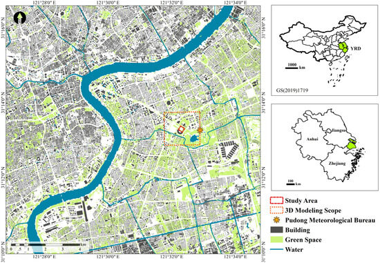 Shanghai, the largest city in China and a Global City of Excellence, belongs to the hot–humid summer and cold winter climate zone [46], with prevailing Southeast (SE) winds in summer and Northwest (NW) winds in winter [47]. Century Square (121°5′ E, 31°2′ N), located in the municipal district of Pudong, Shanghai, was constructed in 1996 and is the starting point of the famous Lujiazui Urban Axis (Figure 2). Reasons as a case study: