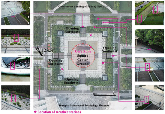 Pudong Century Square was constructed to serve as a central place to set off the spatial power and order of the surrounding government and public buildings. Furthermore, unlike traditional large Chinese municipal squares that sit entirely in the north–south direction [49], its spatial orientation (123.3° from the N-direction) is close to parallel to the direction of the prevailing winds (SE, 135°) [47], which will be tested in this study to see if this is the geometrical form that is optimized for thermal comfort [50,51].