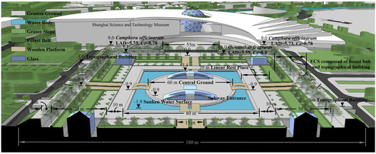 The area of Century Square is 3.6 hm2, with a side length of 180 m × 200 m (Figure 3). The 180 m × 180 m topographical building (5 m height, with a green slope as the outer façade) and the forest belt (9 m height of Camphora officinarum and 6 m height of Osmanthus fragrans) together form a square enclosure structure (with an opening [52] in the midpoint of each side) that defines the inner visual space of the square (Figure 4) [50]. The space is on a medium sense-of-place scale. The center of the square is a 60 m diameter circular granite ground surrounded by a sunken water surface (water depth 10 cm).