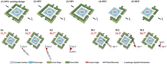The idealized present design is used as a base for element simplification and reconfiguration of landscape spatial types, leading to five types of square modes: (1) OP4, the existing Century Square design, with four openings in the enclosure structure (ECS), one at the midpoint of each side. (2) OP3, an ECS with three openings, eliminates the opening in the direction of the prevailing winter wind. (3) OP1, with one opening in the ECS, retaining only the opening facing the windward direction of the dominant summer wind. (4) HEC, a semi-enclosure structure facing the winter and summer wind directions. (5) HEP, retaining only the plantation oriented to the prevailing winter and summer wind.