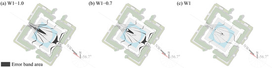 Figure 7 shows that the air velocity error area of each scenario, particularly in the case of the extremely dense grids denoted as W1−0.3, decreases from 6.544% and 5.248% to 1.231% with the increase in the grid number. This trend indicates that the effect of continuing to encrypt the grid on the error has entered the stabilization interval of the convergence curve. Therefore, the mesh scheme W1 belongs to the convergence-independent solution, which can take into account both computational economy and grid discretization error control.