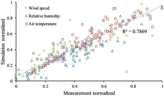 The error analysis between the measured and simulated data of Va, RH, and Ta at the nine observation points showed an overall mean absolute percentage error (MAPE) of 3.9%, a correlation coefficient of 0.89, and a determination coefficient (R2) of 0.79 (Figure 8). The root-mean-squared error (RMSE) for Va was 0.25 m/s. For RH, it was 2.6%, and for Ta, it was 0.65 °C. The errors were within a normal range, validating the effectiveness of the microclimate environmental simulation.