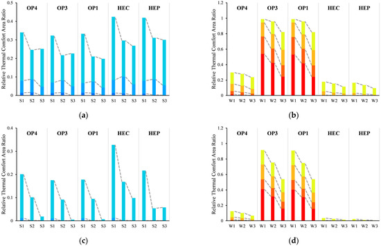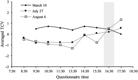 Averaged TCV (Figure 9) reveals that the diurnal variation in winter is a convex curve, with people preferring the sunny, warmer midday hours. In contrast, in summer, it is the opposite concave curve, with people feeling more comfortable with lower morning and evening temperatures and solar radiation. Notably, the most comfortable hours of the winter are the least comfortable in the summer. However, 16:30 in both winter and summer is the time of the thermal comfort transition. In winter, 17:30 is the worst time for daytime microclimate, and 16:30 is the deterioration phase. In summer, 17:30 is the best time for daytime thermal comfort, and 16:30 is the improvement phase.