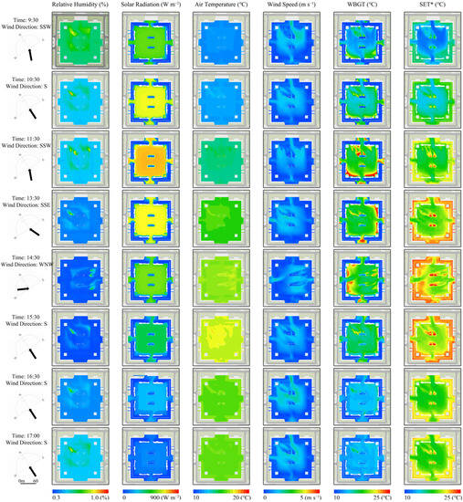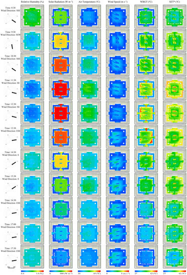 Nine watchdog 2000 weather stations (Table S1) [54,55], shown in Figure 3, were placed to record microclimate parameters, including relative humidity (RH, %), solar radiation (SR, W/m2), air temperature (Ta, °C), and air velocity (Va, m/s), at 1.5 m height above the ground with a 1 min data log interval from 8:30 to 17:30. And the criteria for their location were based on different microclimatic types (opening of enclosed structures, edge of the waterbody, hard ground surface of the unshaded square, shaded area under canopy, roof, and bottom of the topographic building). Measurements were taken on March 10 (winter) and August 6 (summer), both of which were sunny and less cloudy. The measured data were used to calibrate the validity and reliability of the simulation.