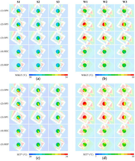 SET* is a thermal comfort index enrolled in the ASHRAE standard [56,85], which is widely used for the metabolic level of human activity around 1 Met [19,86]. SET* is calculated from the previously simulated Va, RH, Ta, and sMRT (spatial Mean Radiation Temperature. In addition, it requires the atmospheric pressure measured at the meteorological station and the human status data (clothing thermal resistance of 0.5 clo in summer and 1.0 clo in winter, metabolic rate of 1.2 Met, height of 167 cm, and weight of 55 kg) [87].
