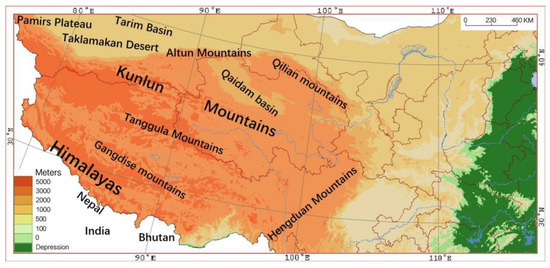 The Qinghai–Tibet Plateau, located in the interior of Asia, is the largest plateau in China and the highest plateau in the world. It is called “the roof of the world” and “the third pole” [1]. The Qinghai–Tibet Plateau ranges from the Himalayas in the south to the Kunlun Mountains, Altun Mountains, and the northern edge of the Qilian Mountains in the north, and from the Pamir Plateau and Karakoram Mountains in the west to the Hengduan Mountains in the east, connecting with the western section of the Qinling Mountains and the Loess Plateau, with a total area of about 2.5 million square meters. It is the plateau with the highest average altitude, the largest area, and the most complex terrain in the world [2,3].