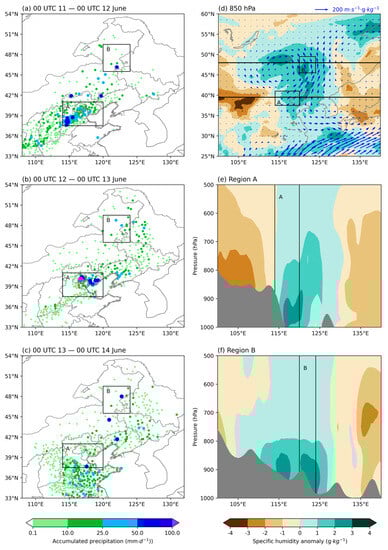 Spatial distribution of accumulated precipitation (units: mm·d−1) (a) from 00 UTC 11 to 00 UTC 12 June, (b) from 00 UTC 12 to 00 UTC 13 June, (c) from 00 UTC 13 to 00 UTC 14 June, (d) 850 hPa specific humidity anomaly (shaded, units: g·kg−1) and water vapor flux (arrows, units: m·s−1·g·kg−1) averaged from 00 UTC 11 to 00 UTC 14 June, and zonal mean pressure−longitude cross−section of averaged specific humidity anomalies over regions (e) A and (f) B from 00 UTC 11 to 00 UTC 14 June. The gray shading represents the topography, and the black rectangles A and B designate the initial domain of LAGRANTO.
