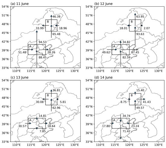 1000–500 hPa integrated water vapor fluxes (units: 106·kg·s−1) across the four boundaries of Regions A and B on (a) 11 June, (b) 12 June, (c) 13 June, and (d) 14 June. The black boxes indicate Region A and B, respectively.