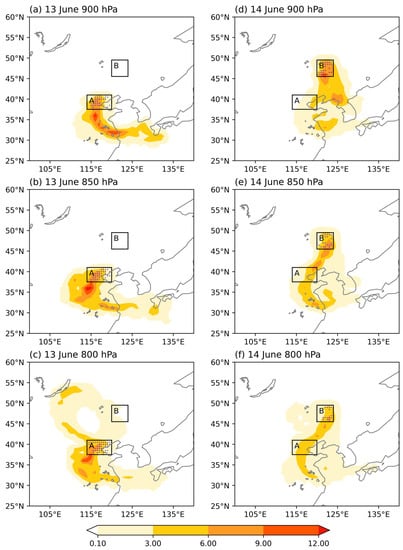 Figure 3 depicts three-day backward trajectory densities of moist air trajectories from 00 UTC on 13 and 14 June for Regions A and B at 800–900 hPa, respectively. Moist air predominantly originated from the Yellow Sea, particularly the Bohai Coast, aligning well with the water vapor flux pattern. Considering Region A, a prominent trajectory density formed an “L” shape originating from the southern Yellow Sea, passing over the Lower Yangtze River Plain and extending towards the North China Plain at 900 hPa (Figure 3a). At higher pressure levels, trajectory densities of moist air increased over the North China Plain, showing a northeast–southwest pattern, indicative of southwesterly in the southeastern part of the NCCV (Figure 3b,c). Furthermore, at 800 hPa, a notable southeastward trajectory density of moist air from Lake Baikal converged with the warm, moist air from the North China Plain and the Yellow Sea within Region A.