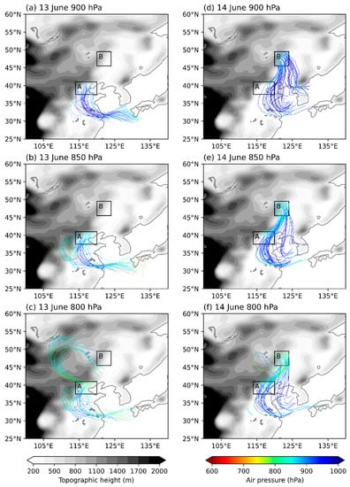 The distribution of trajectories (curves) of moist air started from grid points in Region A at (a) 900 hPa, (b) 850 hPa, and (c) 800 hPa on 13 June. The color shading indicates the air pressure (hPa) of trajectories. Gray shading designates topographic height (units: m). (d–f) as (a–c), but for Region B on 14 June.