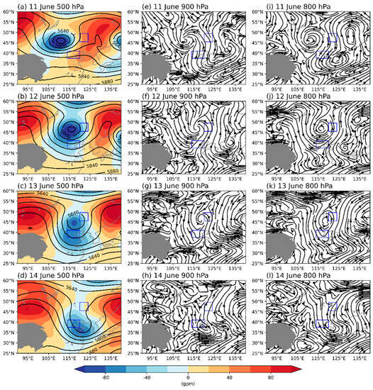 The 500 hPa geopotential height (contours, units: gpm) and its anomalies (shaded) on (a) 11 June, (b) 12 June, (c) 13 June, and (d) 14 June. The streamlines at 900 hPa and 800 hPa are shown in (e−h) and (i−l), respectively. The blue boxes indicate the start region in the LAGRANTO model.