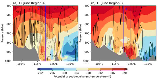 Zonal mean pressure-longitude cross-section of the potential pseudo-equivalent temperature (shaded, units: K) and vertical velocity (contours, units: Pa·s−1) on (a) 12 June 2022 over Region A and (b) 13 June 2022 over Region B. The contour intervals are drawn for 0.1 Pa·s−1. The dashed and solid contours indicate upward and downward motions, respectively. The thick solid contour represents zero. The gray shading represents the terrain, and the blue vertical lines designate Region A and B.