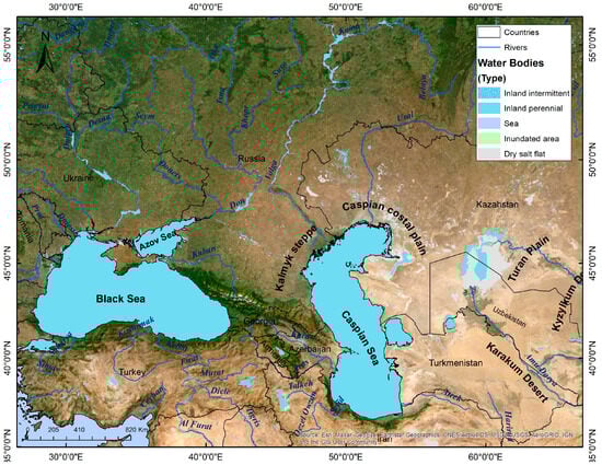 In areas with dry and scattered vegetation, wind erosion can easily occur, leading to the transportation of dust over long distances (up to 1500 km). The Kalmyk steppe is located in the arid belt of the Russian Federation (Figure 1), where desertification is fully manifested (up to 80%) [2]. Depending on the synoptic conditions, dust particles can be transported over long distances and can accumulate at ground level and at high altitudes. Moreover, dust particles can remain in the lower troposphere for several days. Studies related to the transport of Saharan dust to Europe are numerous [3,4,5,6], but only a few have considered dust particles of Asian origin [7]. Saharan dust is the main research subject in terms of mineral dust transport events. In this context, this paper details the synoptic circumstances that determined the transport of mineral dust in August 2022, having the arid regions of western Asia as its source. For Romania, the first studies related to synoptic and circulation types concluded that westerly circulation is the most frequent during a year [8]. Nita I. A. et al. [8] in 2022 grouped 27 synoptic types in 11 classes. In this sense, in their study they showed that during the warm season, the highest percentage (25% of the data series) was represented by the undefined synoptic type, followed by the cyclonic type (2.6% of the data series) in second place, and the east anticyclone type (5.1% of the data set) in the third position. In places five and six, the most frequent synoptic types are north anticyclonic/north cyclonic and northeast anticyclonic/northeast cyclonic [8]. The event analyzed in this paper took place in a synoptic context of easterly circulation, which is the third-most frequent circulation during the summer at the latitude of Romania. To this non-negligible frequency was added a very important factor: the drought that covered Europe and western Asia in 2022 [1]. This drought further exacerbated the aridity of the Caspian region. In such conditions of intensified easterly airflow, mineral dust was carried towards Romania. According to the climatology of August determined by the National Meteorological Administration (NMA) [9], in Romania, it is the hottest month of the year as a result of the activity of the ridge of the Azores High, which exists over Eastern Europe. This phenomenon facilitates the influx of tropical air masses from North Africa. In the analyzed event, at the end of August in 2022, the eastern part of Romania was not under the influence of the ridge of the Azores High but rather of easterly circulation.