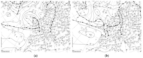 Synoptic maps at ground level. Black lines represent isobars (hPa) for 23 (a) and 22 (b) of August 2022 [14] (closed contour lines: isobars (i.e., lines of equal pressure); curved line with triangles: cold atmospheric front; curved line with black semicircles: warm atmospheric front; curved line with semicircles and triangles: occluded atmospheric front; letter H: symbol for the atmospheric high pressure field, letter D: symbol for the atmospheric low pressure field; values below 1015 mb: cyclonic field (low pressure); values above 1015 mb: anticyclonic field (high pressure); values and small symbols scattered on the map in the background: Bjerknes scheme).