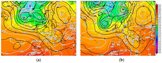 Synoptic maps at 500 hPa level for 22 August (a) and 23 August (b) 2022. Black lines represent isohypses (gpdam) and white lines represent isobars (hPa) at ground level; Romania’s borders are outlined in red [14]. (thick black lines: surfaces with equal geopotential values; thin white lines: isobars (i.e., lines of equal pressure); letter H: symbol for the atmospheric high pressure field; letter D: symbol for the atmospheric low pressure field; color palette: interpolated geopotential values).
