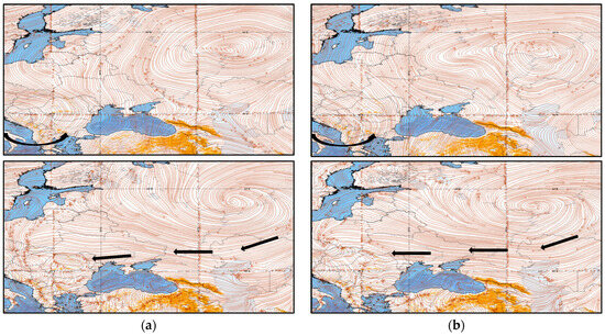 Streamlines for (a) 22 August 2022 (500 hPa level—above, ground level—below) and (b) 23 August 2022 (500 hPa level—above, ground level—below). (more intensely colored areas: landforms area; curved lines: streamlines (these vectors describes the flow of air masses); thick black arrows: movement direction of the currents).