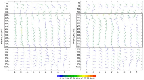 Vertical wind profile (wind bars—speed in m/s and direction, Y axis—pressure (mb), X axis—time—every 3 h) for 22 August (left) and 23 August (right) 2022. (the gray boxes: group the heights between which the wind has a southerly direction).
