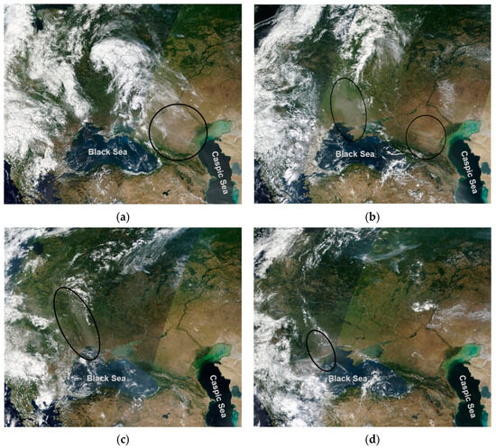 MODIS satellite images for 21 August (a), 22 August (b), 23 August (c), and 24 August (d) 2022 (dust from the Russian steppes is highlighted inside the circles).