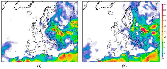 MERRA-2 reanalysis data (Figure 8) show that high concentrations of dust particles were located north and west of the Black Sea, originating in these dry steppes [17]. These particles were transported over long distances, reaching the atmosphere of Romania mainly on 23 August, when the particles flooded the atmosphere of the eastern part of Europe, reaching as far as Germany and Poland, as well as the Baltic countries. The highest concentrations, over 180 μg/m3, were detected in the east of Romania, without crossing the Carpathian arc to the west. The flow of particles was continuous during the analyzed period. On 22 August the dust had the highest concentrations (over 300 μg/m3) and was concentrated in Ukraine, in the Dnieper basin, and in the East European Plain. Later, on 23 August, the dust moved over the eastern part of Romania, the Republic of Moldova, and the northern countries of Eastern Europe, with slightly lower concentrations.