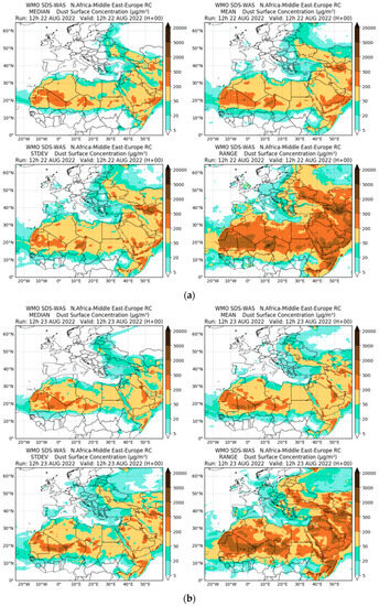 European ensemble model—dust surface concentration (μg/m3) for 22 August (a) and 23 August (b) 2022 (Run 12h)—median (upper left), mean (upper right), stdev (bottom left), range (bottom right).