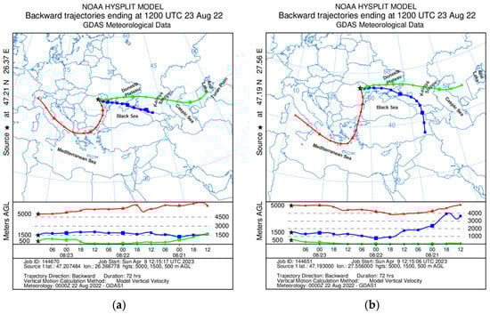 Backward trajectories ending at 12:00 UTC for 23 August 2022 (duration: 72 h) ((a)—for Târgu Neamț observation point, (b)—for Iași observation point).