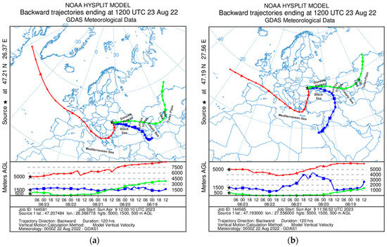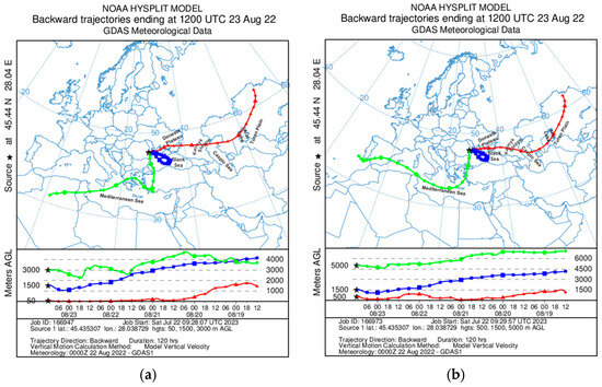 Backward trajectories ending at 12:00 UTC for 23 August 2022 (duration: 120 h) for the REXDAN-Galați observation point ((a)—altitudes: 500, 1500, 3000 m, (b)—altitudes: 500, 1500, 5000 m).