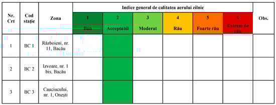 Bulletin of air quality in Bacău county—general air quality index for 23 August 2022 (1—good, 2—acceptable, 3—moderate, 4—bad, 5—very bad, 6—extremely bad).