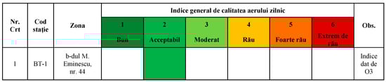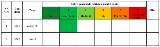 Bulletin of air quality in Vaslui county—general air quality index for 23 August 2022 (1—good, 2—acceptable, 3—moderate, 4—bad, 5—very bad, 6—extremely bad).