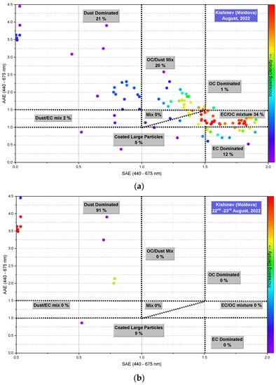 Absorption Ångström exponent [AAE at 440–675 nm] vs. scattering Ångström exponent [SAE at 440–675 nm] in the number density plot from Republic of Moldova (Kishinev) monitoring site: (a) August of 2022 (b) 22–23 August 2022.