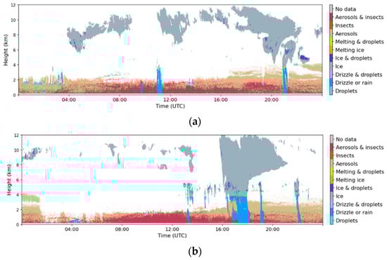 Combined results of radar and lidar data for 22 August (a) and 23 August (b) (Cloudnet image from UGAL–REXDAN).