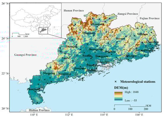 Our study area, Guangdong Province, comprises a land territory of 179,800 km2 with a coastline of 4114 km that is oriented from east to west (Figure 1). The province is geographically separated from the north of China by the Southern Mountain Range. The topography of Guangdong is high in the north and low in the south, with mountains taking up 33.7% of the total area; the remaining landscape is composed of hilly areas (24.9%), terraced land (14.2%), and plains (21.7%). From north to south, Guangdong features a mid-subtropical climate, a south subtropical climate, and a tropical climate. The annual average temperature in Guangdong is between 19 and 24 degrees Celsius, while the annual rainfall ranges from 1400 to 2000 mm. Almost 80% of the annual rainfall occurs in the rainy season from April to September, which can be divided into two periods of precipitation. The first rainy season (FRS) is from April to June, during which the precipitation mostly comprises frontal precipitation. The second rainy season (SRS) is from July to September, during which time the precipitation is mostly caused by TCs. The non-rainy season (NRS) runs from January to March and from October to December.