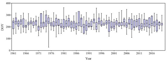 Figure 3 shows the distribution of the occurrence time of TC precipitation in Guangdong Province from 1961 to 2020. It can be seen that TC precipitation in Guangdong covered a large time span and mainly occurred in the period from May to November on the days of the year (DOY) in the period from day 120 to day 330, with slight fluctuations from year to year. The earliest recorded DOY with TC precipitation occurred on 27 January 1975, while the latest recorded DOY with TC precipitation occurred on 29 December 1981.