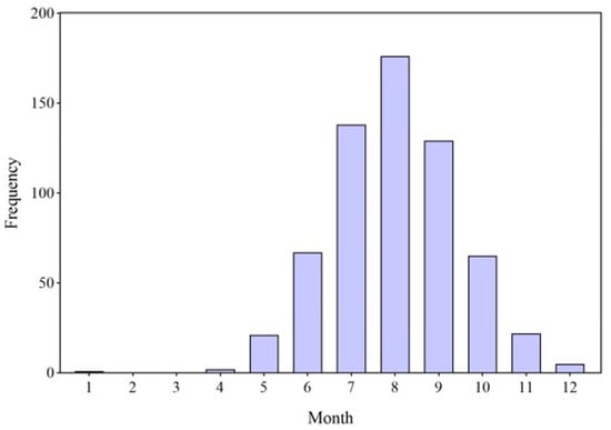 As shown in Figure 4, 90 of the 626 identified TCs occurred in the FRS, accounting for 14.4% of the total; 443 TCs occurred in the SRS, accounting for 70.8% of the total; and 93 TCs occurred in the NRS, accounting for 14.9% of the total. The seasonal variations in the TCs affecting Guangdong are closely related to the genesis of TCs in the WNP and SCS. From January to April, most TC genesis occur south of latitude 15° N; from May to August, the region of TC genesis gradually extends northward. Meanwhile, the deep-layer-mean steering flow also tends to steer the TCs further northward. As a result, TC activity drifts slowly northward during May and June to make landfall in South China. By July and August, the TC landfall activity increases and shifts further north. Finally, in September, the landfall activity reverses and moves back toward the south [].