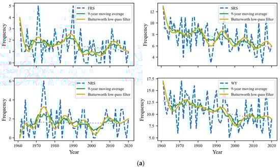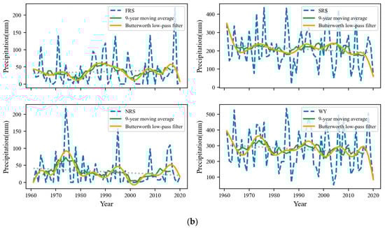 To explore the characteristics of inter-decadal change, we used a multi-year moving average and the Butterworth low-pass filtering method to process the data [,,].