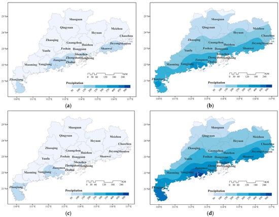 Spatial distribution of multi-year average TC precipitation in Guangdong Province: (a) FRS; (b) SRS; (c) NRS; (d) WY.