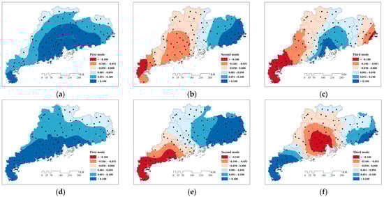 Figure 7 shows the spatial distribution of the eigenvectors of the first three modes identified in the EOF analysis of the TC precipitation anomaly field in the FRS, SRS, and NRS, and for the WY. The eigenvector values corresponding to the first mode in the four periods are all positive, indicating that the trend of precipitation in the province during these periods is highly consistent, which means that TC precipitation in the whole province is either consistently more than normal or consistently less than normal. However, spatial distributions of the eigenvectors in different periods are different. Regarding the FRS, the high-value center was mainly located in the Pearl River Delta and decreased outward. Regarding the SRS and the WY, the high-value centers were mainly located in the western coastal cities, such as Zhanjiang, Maoming, Yangjiang, Jiangmen, Zhuhai, and Zhongshan, and decreased from southwest to northeast. Regarding the NRS, the high-value centers were mainly concentrated in the central and eastern coastal cities, such as Zhuhai, Zhongshan, Shenzhen, Huizhou, Shanwei, and Jieyang, and decreased from the coast to the inland stations.