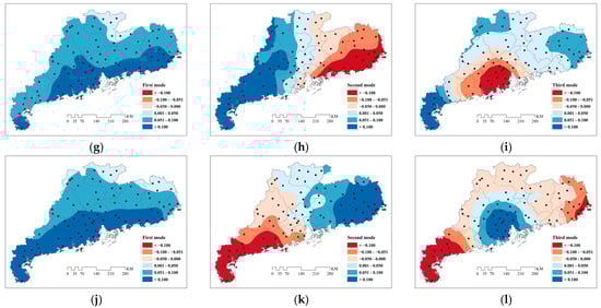 The spatial distribution of the first three modal eigenvectors of the TC precipitation anomaly field: (a–c) FRS; (d–f) SRS; (g–i) NRS; (j–l) WY.