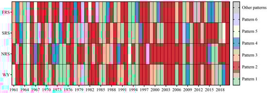 In the past 60 years, it can be seen that pattern 2 occurred most frequently for all four periods (FRS, SRS, NRS, and the WY), and there was an increasing trend in recent years. Regarding the FRS, pattern 2 appeared 27 times over 60 years, accounting for nearly 50%, while other pattern’ appearances were all less than 10 years. Regarding the SRS, pattern 1 and pattern 2 appeared 15 times and 26 times, accounting for 25% and 43%, respectively. Regarding the NRS, pattern 1 and pattern 2 appeared 11 times and 36 times, accounting for 18% and 60%, respectively. Regarding the WY, pattern 1 and pattern 2 appeared 21 times and 26 times, accounting for 35% and 43%, respectively.